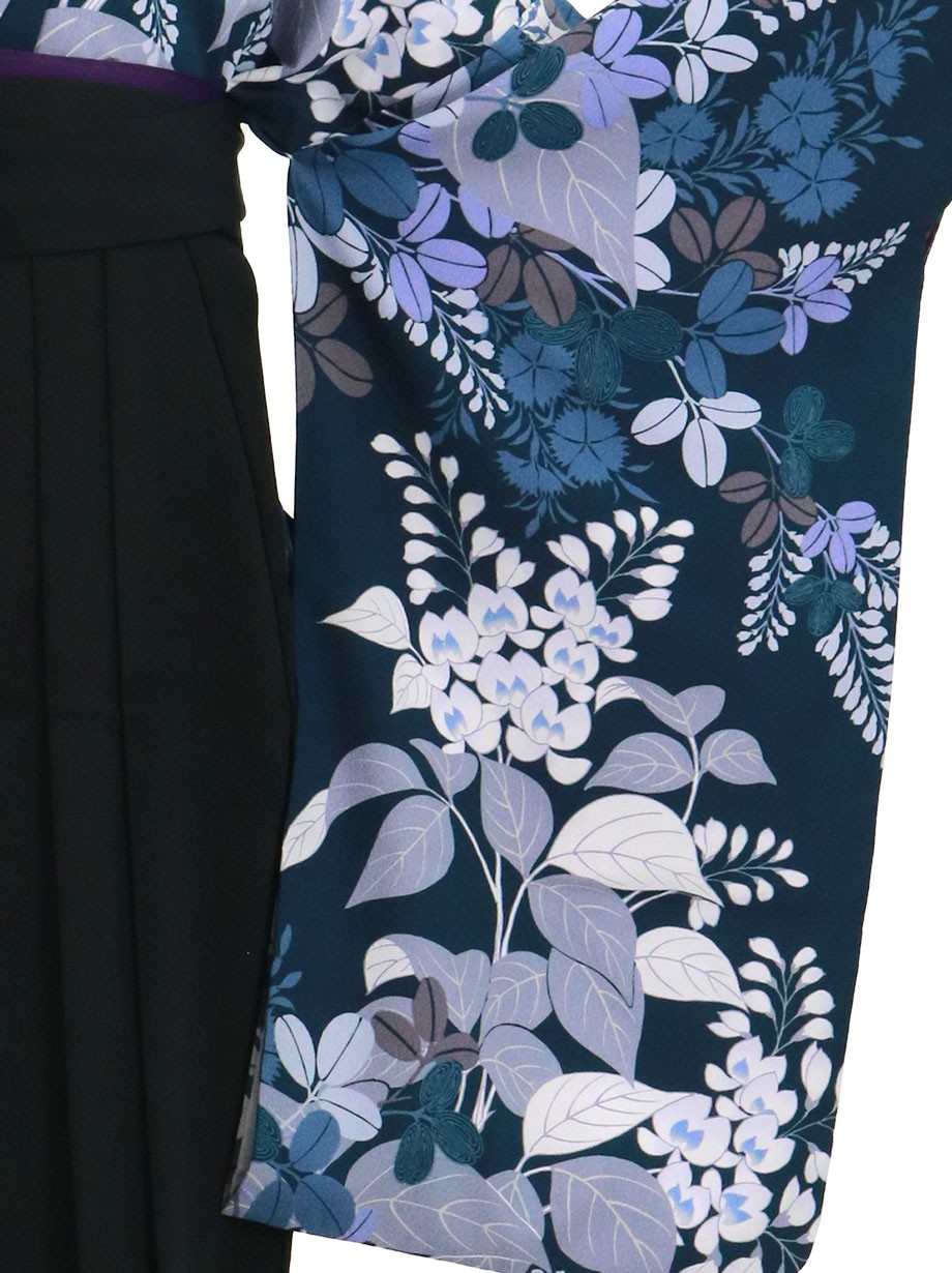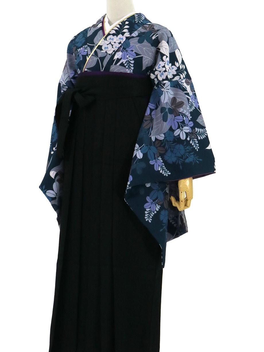 紺地に秋草・黒袴(無地) (二尺袖)/卒業式