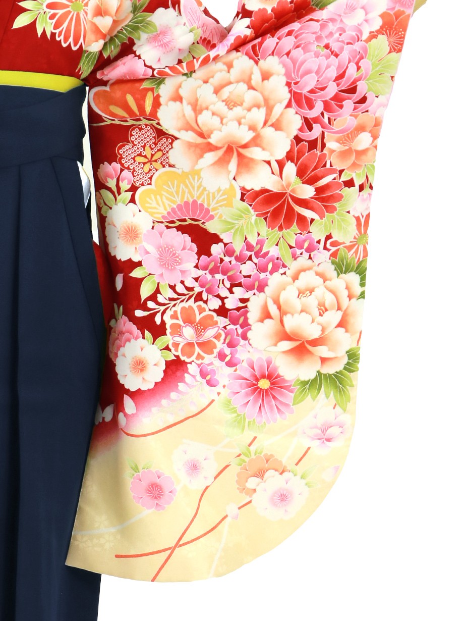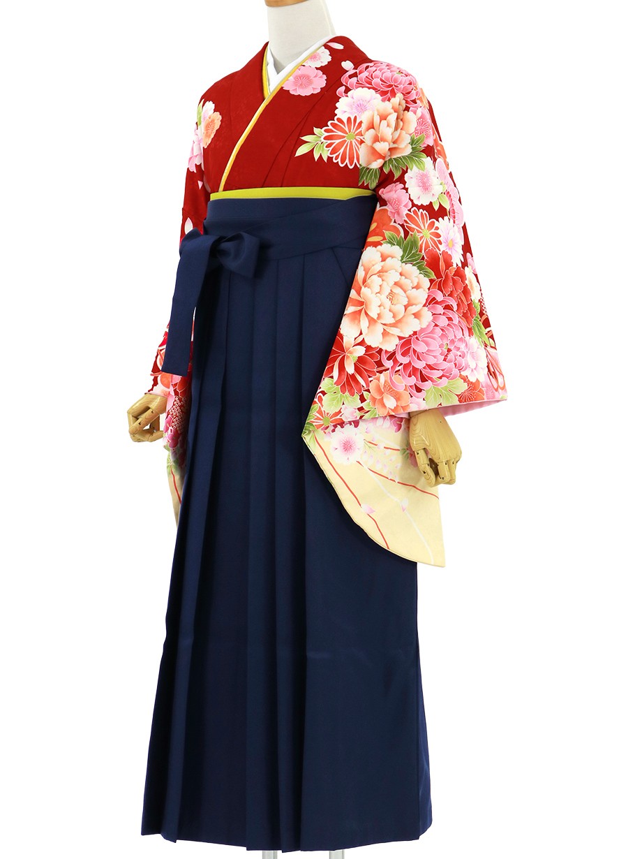 赤地に大輪の花・紺袴(無地) (二尺袖)/卒業式