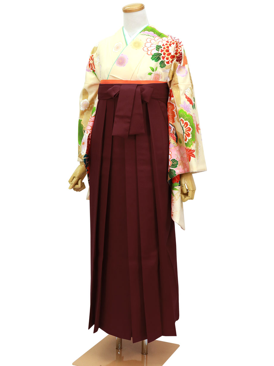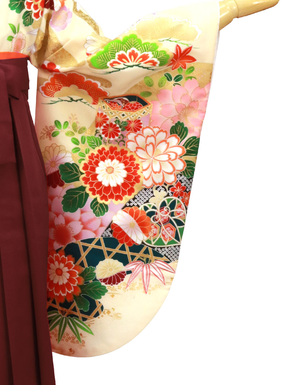 【人気セット】クリーム色地に花と貝桶・臙脂袴(無地) (二尺袖)/卒業式