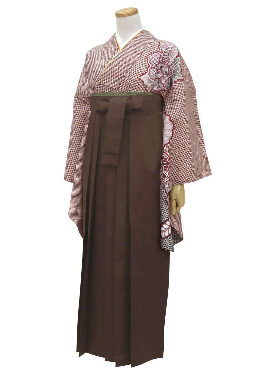 赤地に疋田牡丹・茶色袴(無地) (二尺袖)/卒業式