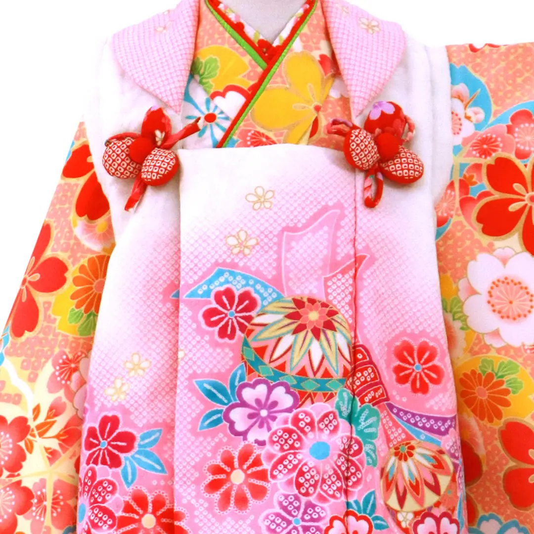 【七五三着物レンタル(三歳女の子)8点フルセット】クリームイエローの地にピンクの鹿の子が入った着物には、桜模様が色とりどりで描かれ柔らかくも華やかな雰囲気となっています。ピンクと白の被布コートは桜と鞠、熨斗が描かれた可愛らしいデザインです。七五三(753)の前撮り・写真撮影やお参りに。※簡単な着付け方シートをご用意しております。詳細は商品に同梱のチェックシートに記載されているQRコードを読み取ってください。※肩揚げ・腰揚げは外さないでください。※商品によって柄の位置が画像と異なります。