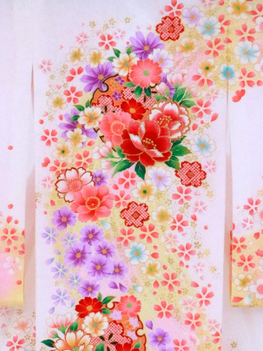 【お宮参り・産着レンタル5点フルセット】右袖下から肩をとおり、裾に向かって流れるように大小様々な大きさのお花が描かれています。色とりどりの花びらが舞っている姿はまるで風にのってたなびく花吹雪のよう。白色・ピンク色・クリーム色のやわらかい色味が一層の可愛らしさを引き立てます。