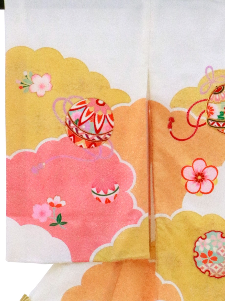 【お宮参り・産着レンタル5点フルセット】雲取りの上に描かれた鈴、鼓、熨斗目が可愛らしさと高級感を醸し出しています。背中の鞠は金駒(きんこま)で縁取られており、お子様の晴れの日にふさわしい豪華な祝い着です。