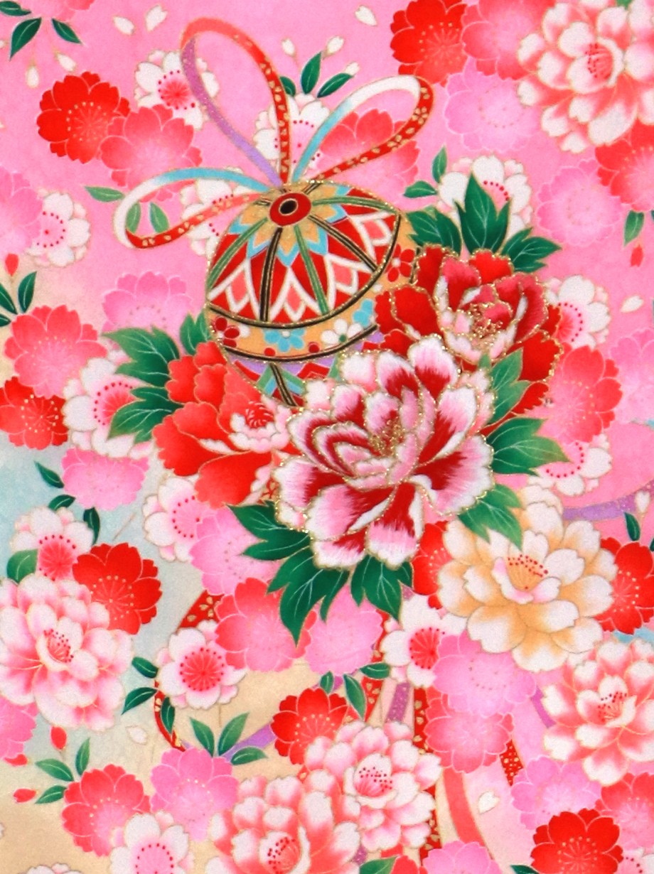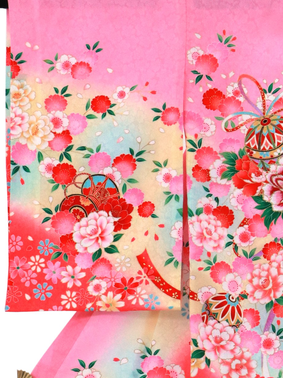 【お宮参り・産着レンタル5点フルセット】可愛らしいピンクに女性らしさを表す牡丹がふんだんに描かれた祝い着。鞠や鼓など吉祥柄が配置されています。神社へのお宮参りの晴れ着や記念撮影に。