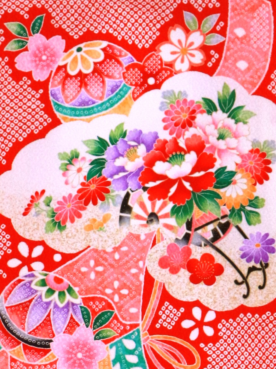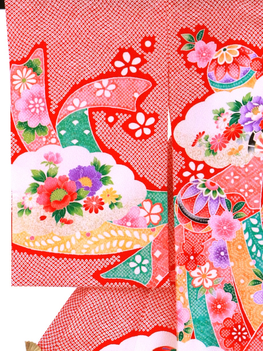 《赤ちゃんのお宮参りに》古典的な疋田の地に熨斗と鞠が華やかな祝い着/レッド