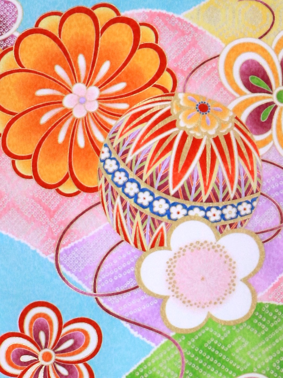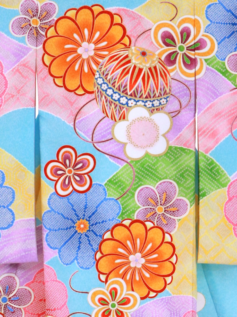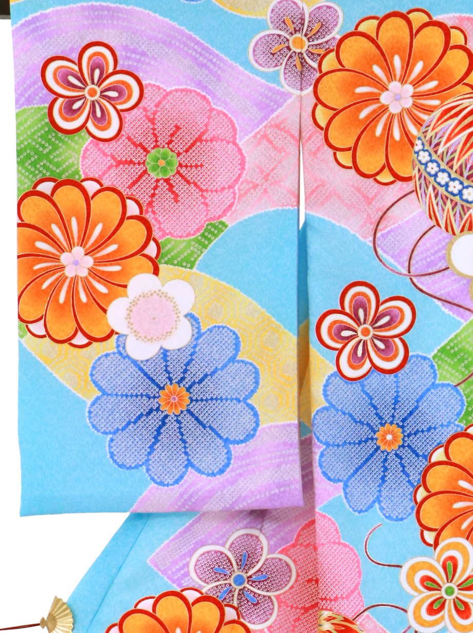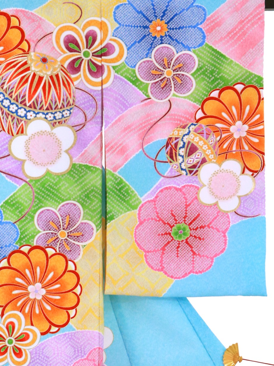 【お宮参り・産着レンタル5点フルセット】水色の地にカラフルな山取りが描かれ、その上に花紋と鞠が置かれたどこかモダンで可愛らしい雰囲気の祝い着です。神社へのお宮参りの晴れ着や記念撮影に。