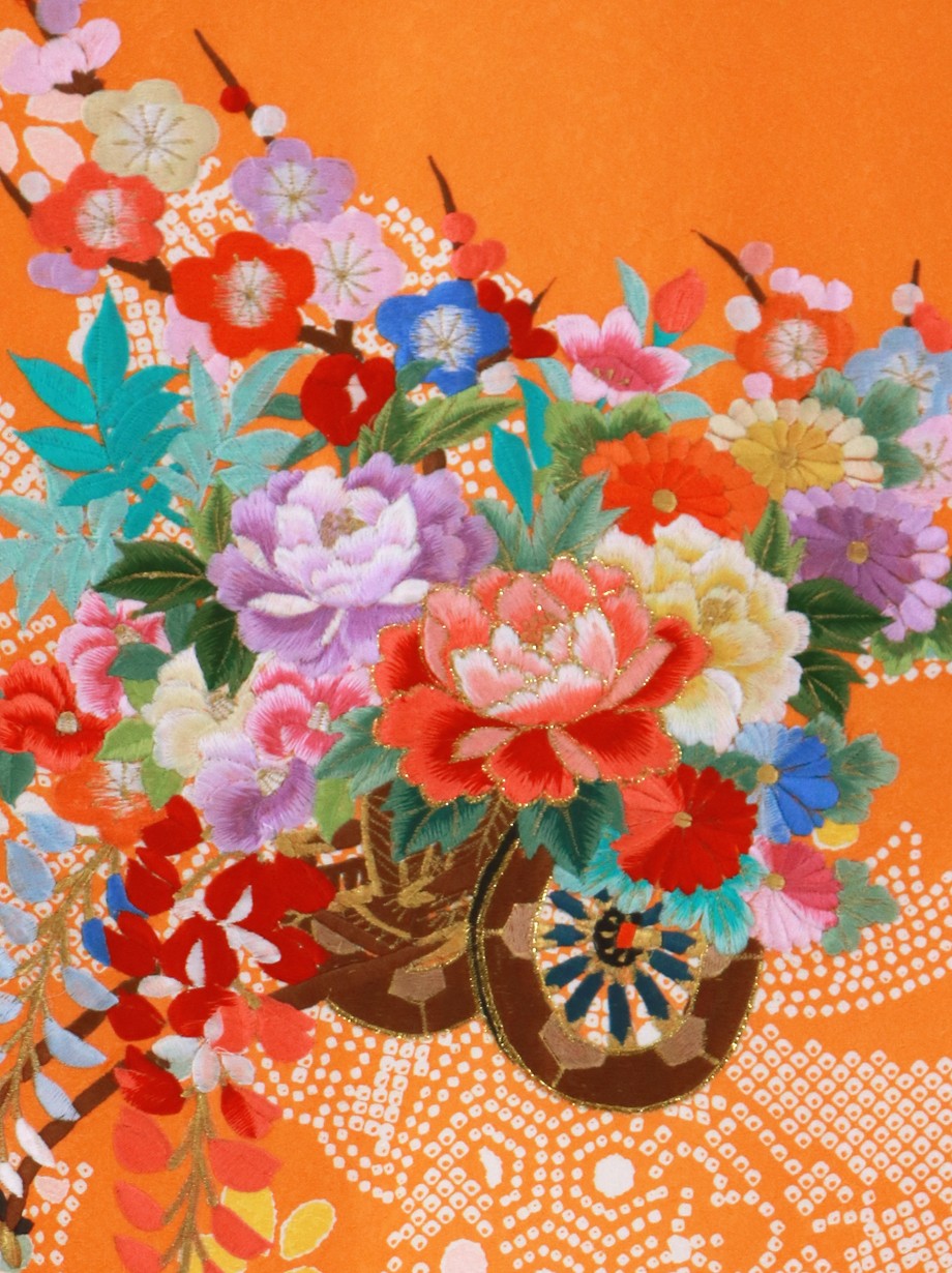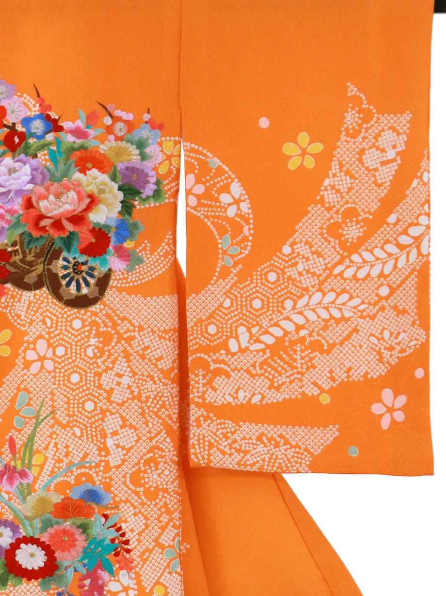お宮参り産着/橙地に疋田の熨斗と花車の祝い着/女児