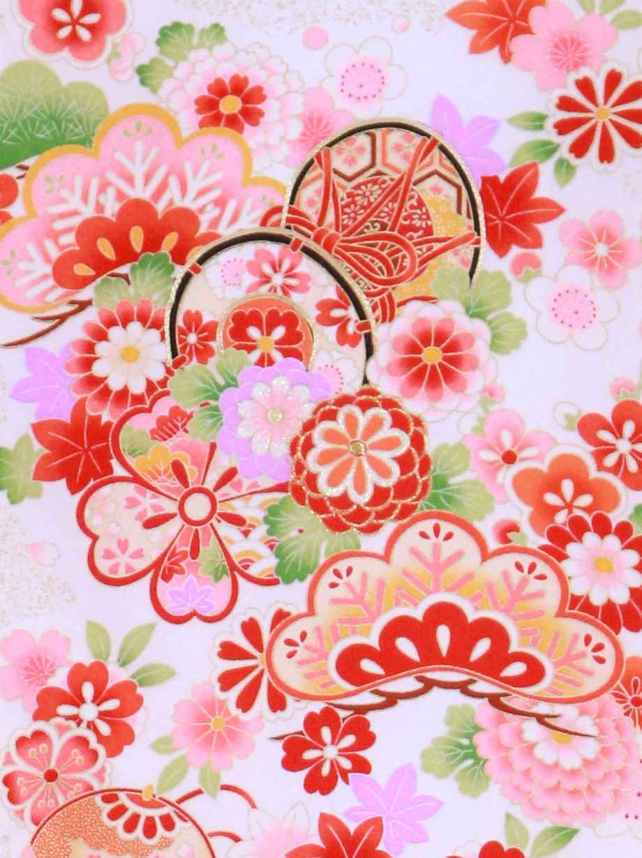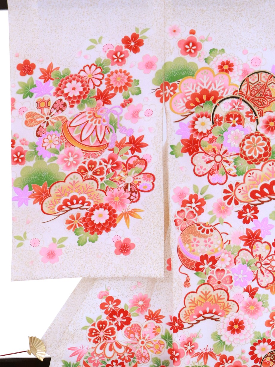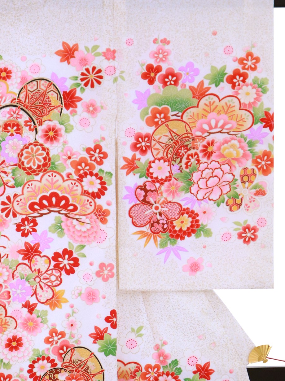 お宮参り産着/白と金箔地に鼓と花尽くしの祝い着/女児