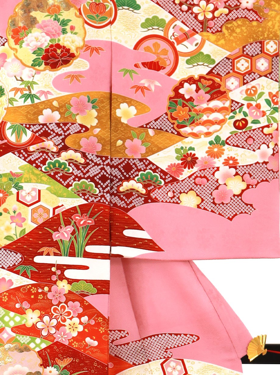 【お宮参り・産着レンタル5点フルセット】ピンクの地に様々な吉祥文様が描かれた山取りと雪輪が印象的な祝い着。どこかモダンで可愛らしい雰囲気のある意匠です。神社へのお宮参りの晴れ着や記念撮影に。
