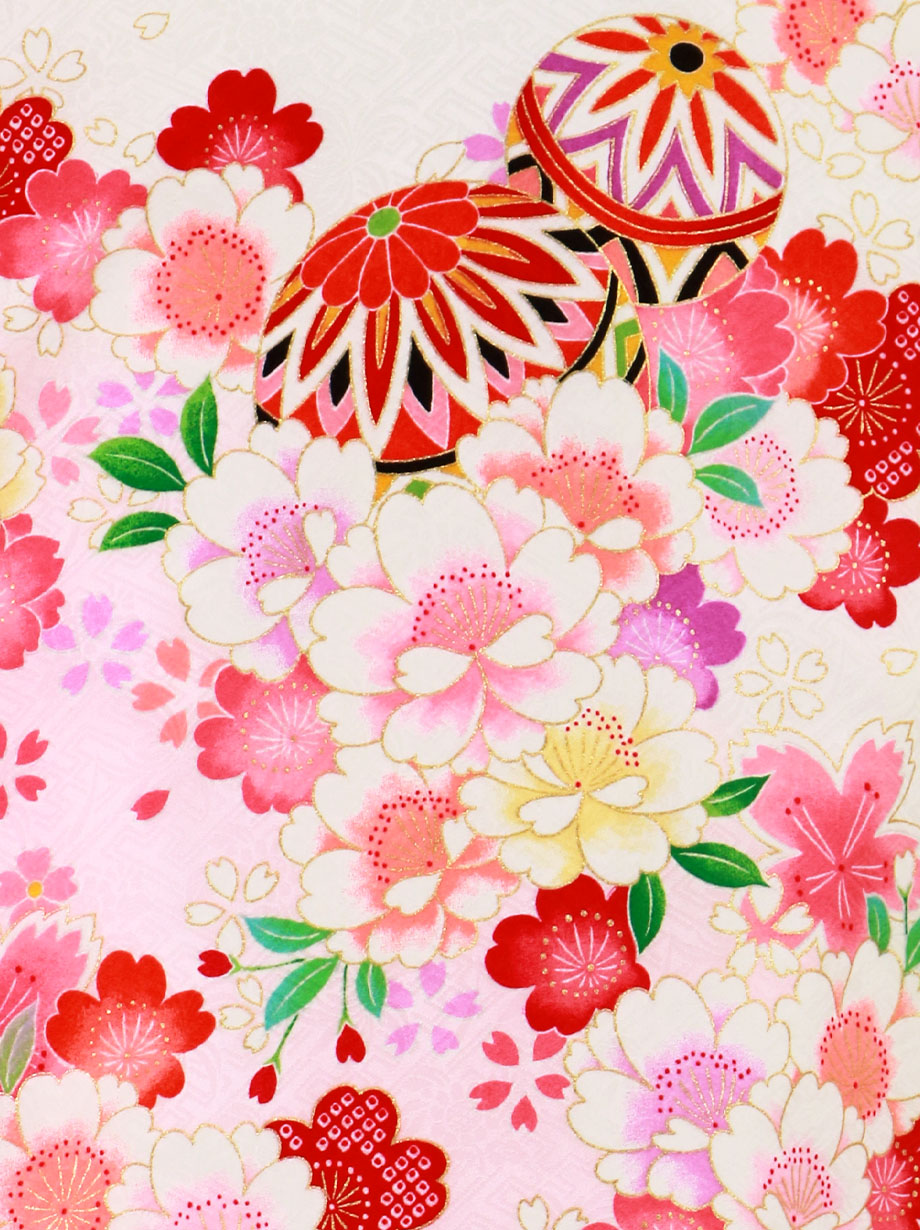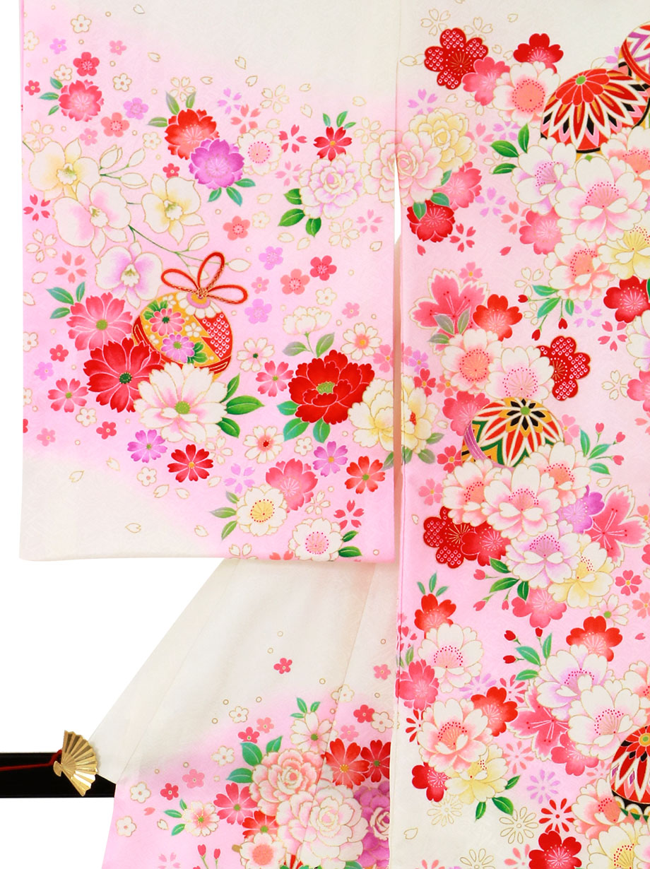【お宮参り・産着レンタル5点フルセット】白の地に優しいピンク色が可愛らしい祝い着。無数に描かれた桜などの花々と鞠が女の子らしい印象を与える意匠です。神社へのお宮参りの晴れ着や記念撮影に。
