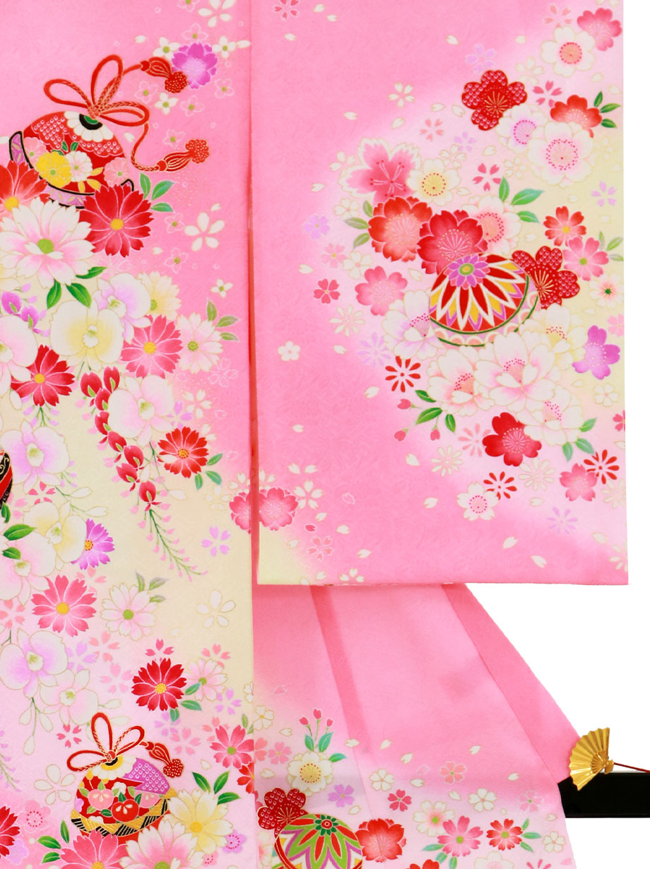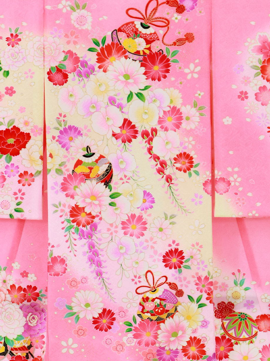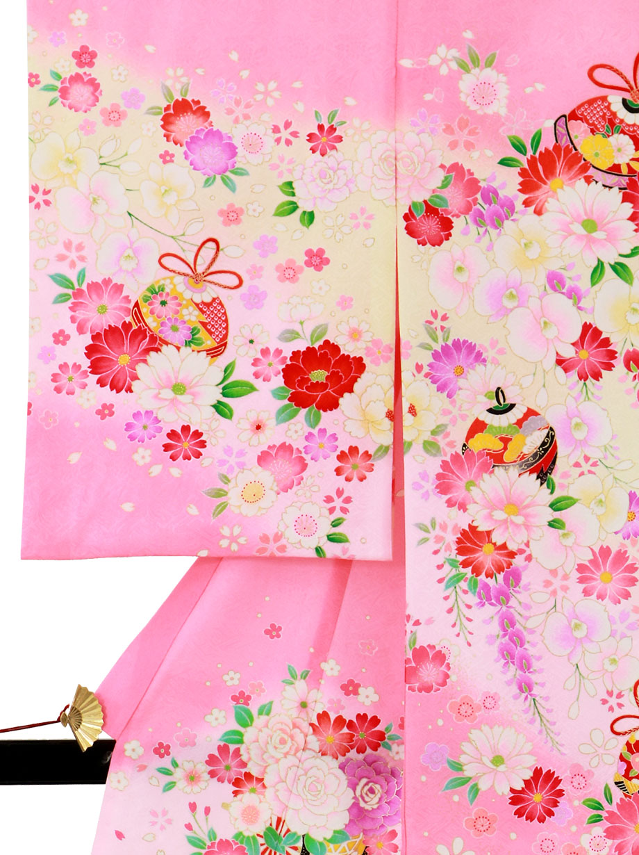 【お宮参り・産着レンタル5点フルセット】ピンクの地に優しいクリーム色が可愛らしい祝い着。無数に描かれた桜などの花々と鞠が女の子らしい印象を与える意匠です。神社へのお宮参りの晴れ着や記念撮影に。