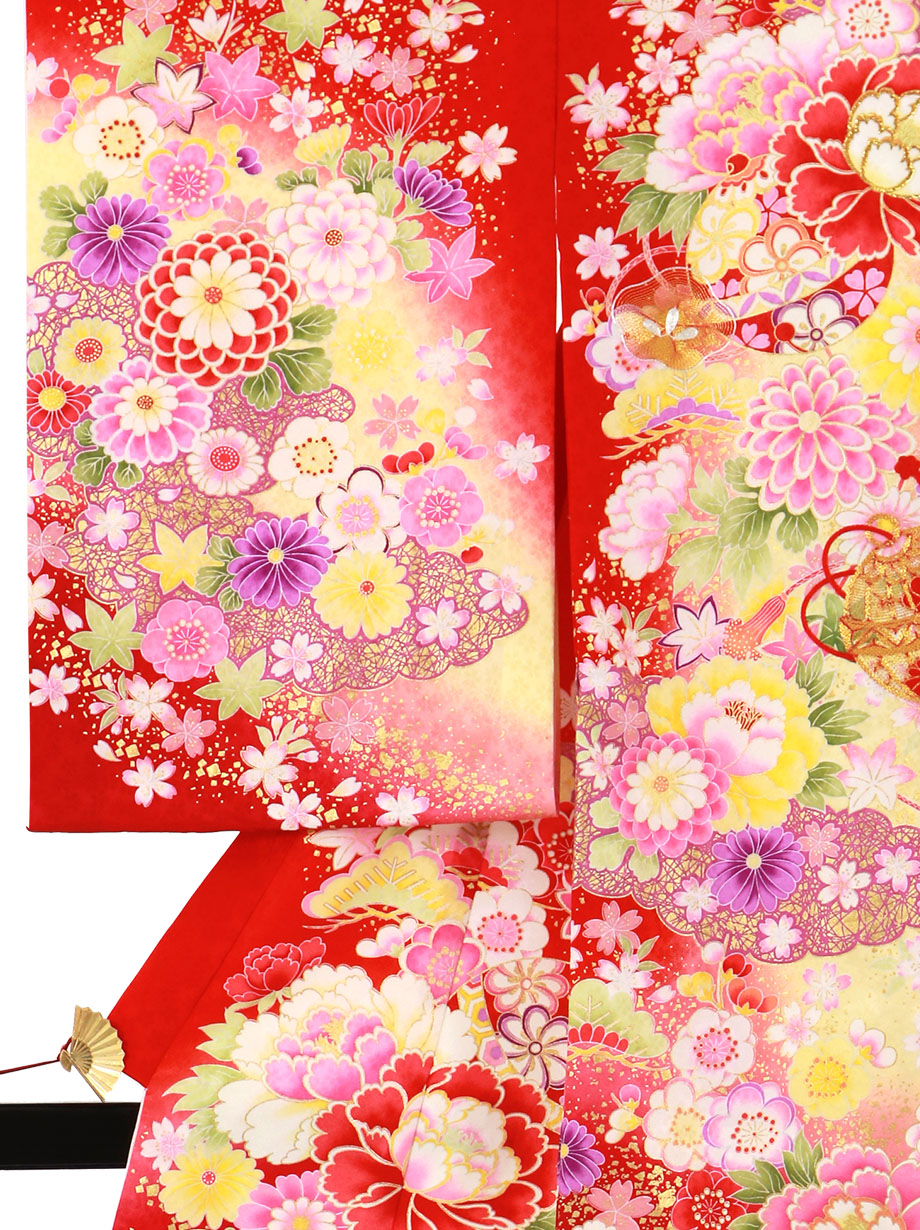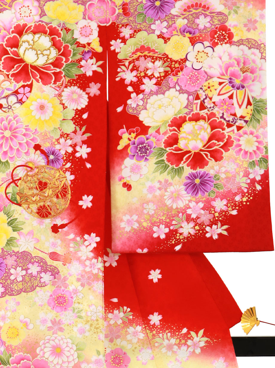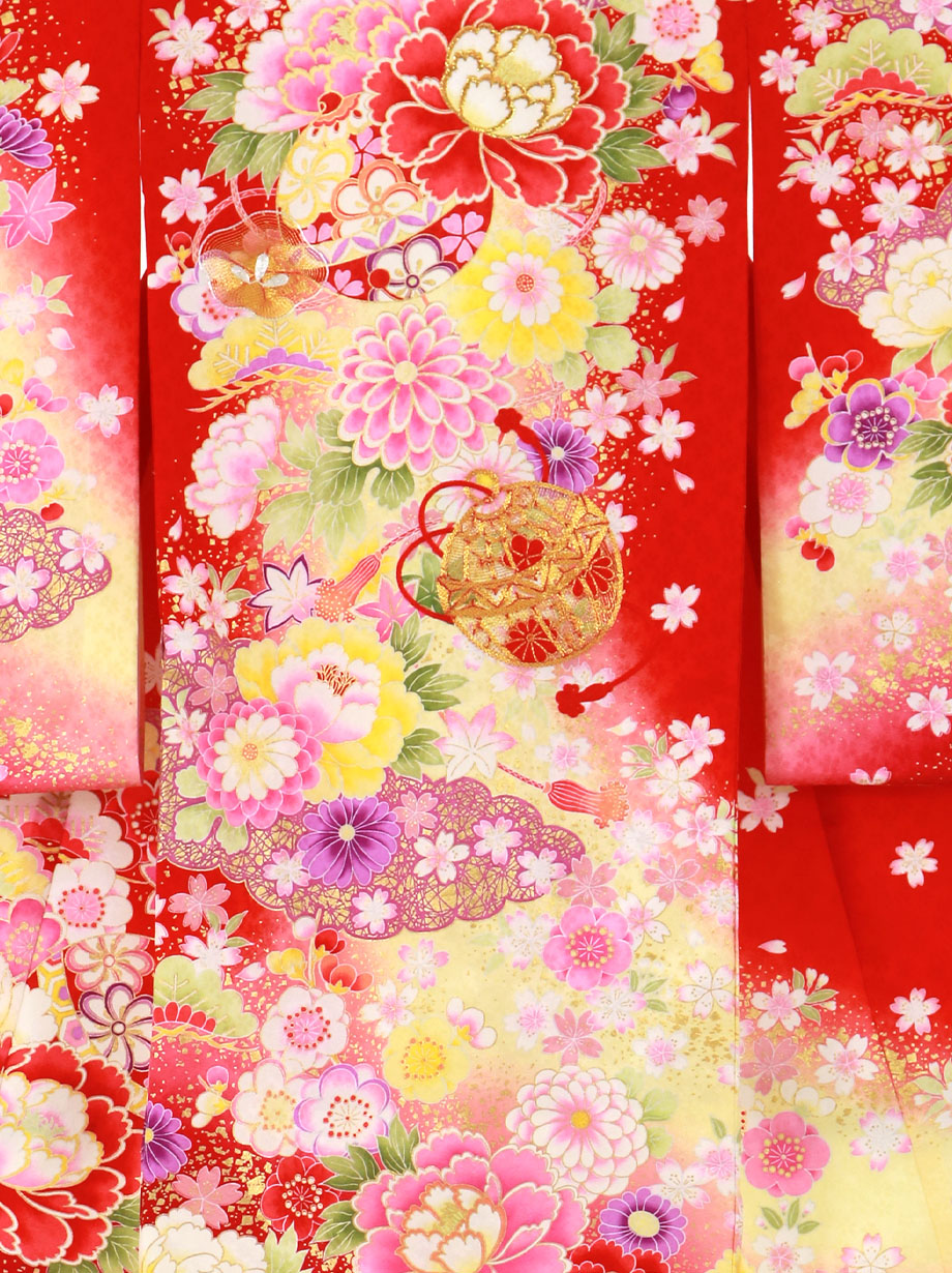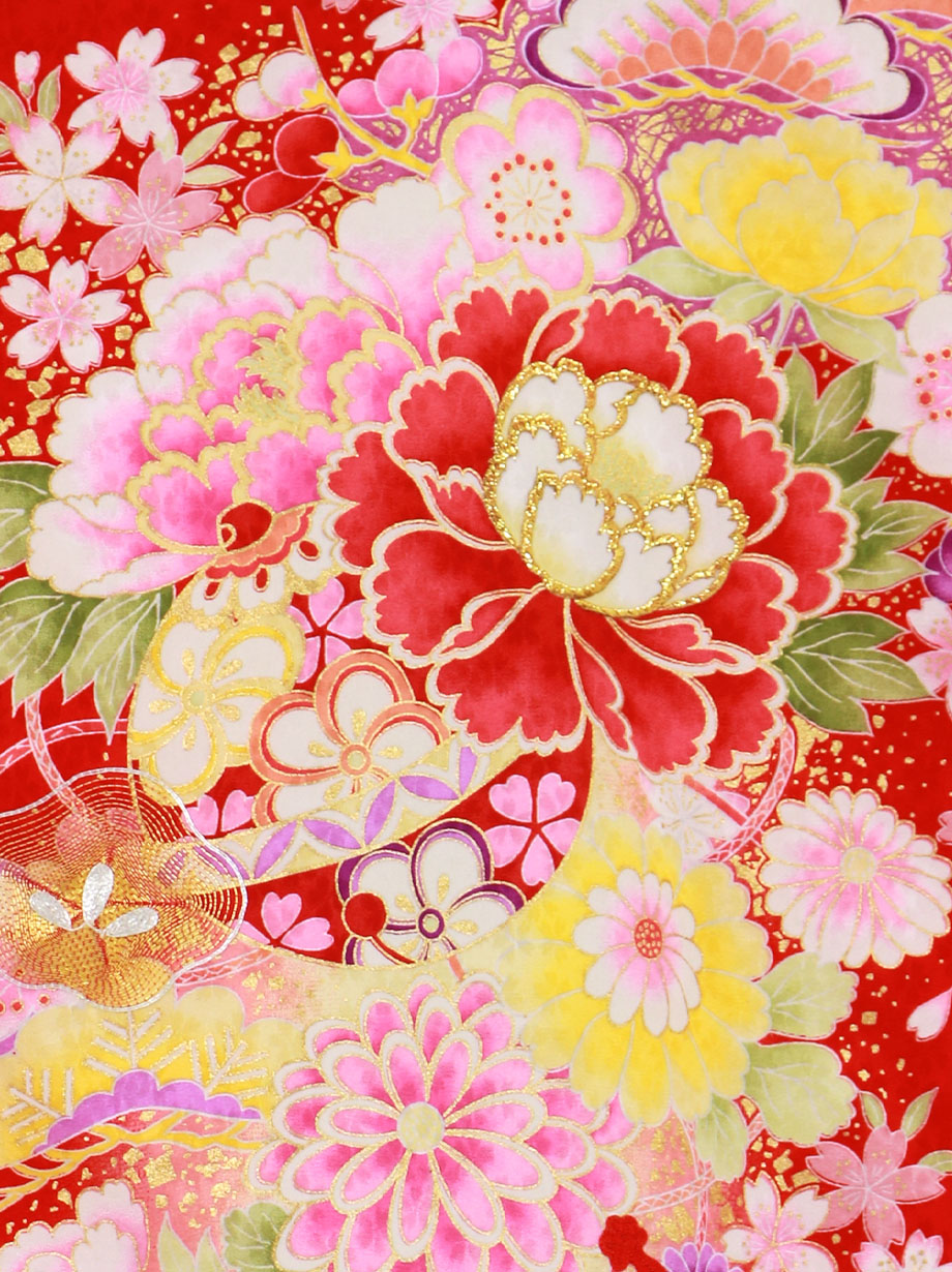 《赤ちゃんのお宮参りに》埋め尽くす花々と金のとても豪華な祝い着/レッド