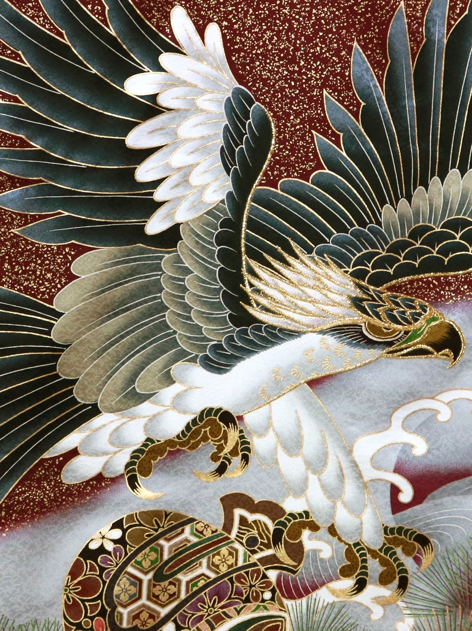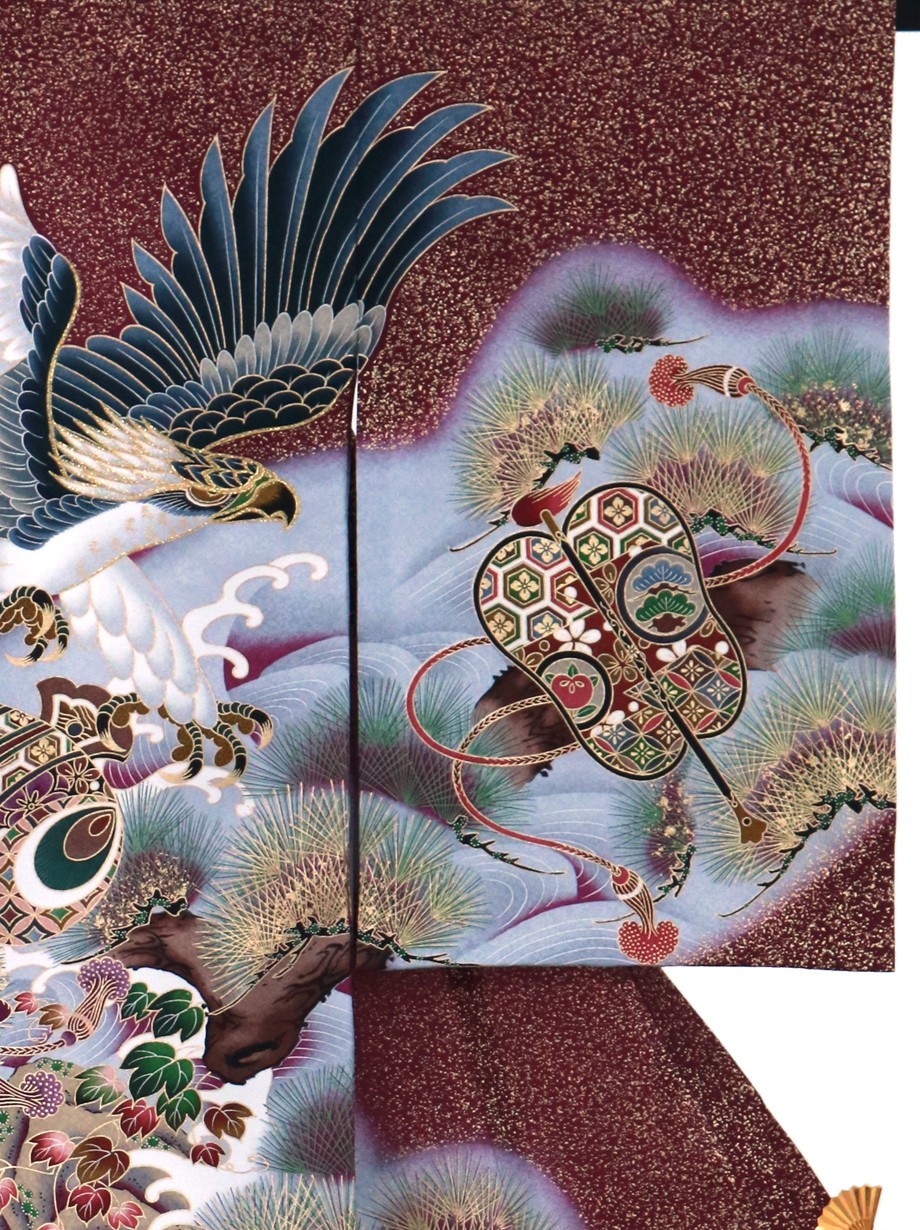 お宮参り産着/紫檀(したん)色に金箔、鷹の祝い着/男児