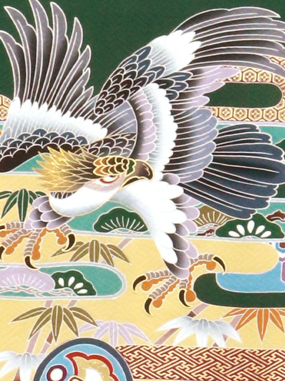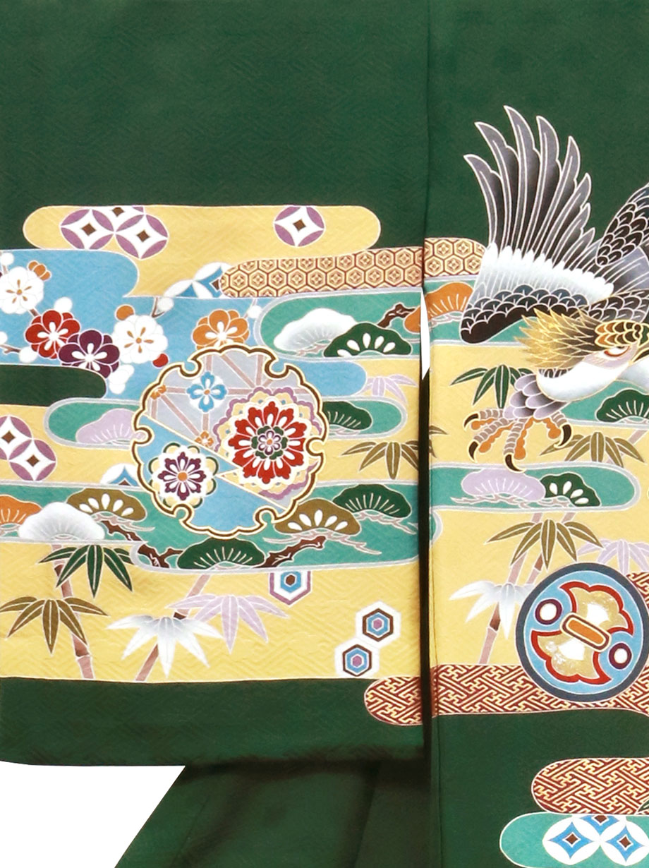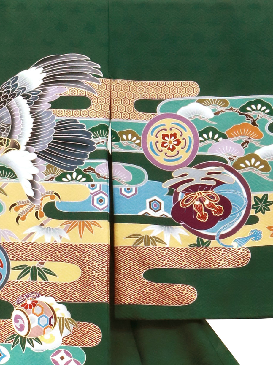 お宮参り産着/緑地に鷹とエ霞文に祝い袋の祝い着/男児