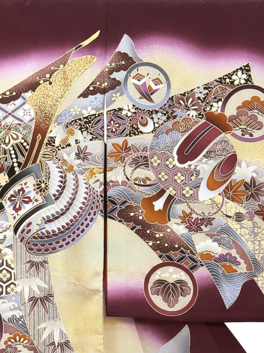 【金彩】お宮参り産着/葡萄色地に兜と束ね熨斗、紋尽くしの祝い着/男児