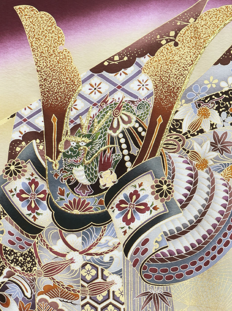 《赤ちゃんのお宮参りに》兜と熨斗が上品かつ金彩がとても豪華な祝い着/パープル