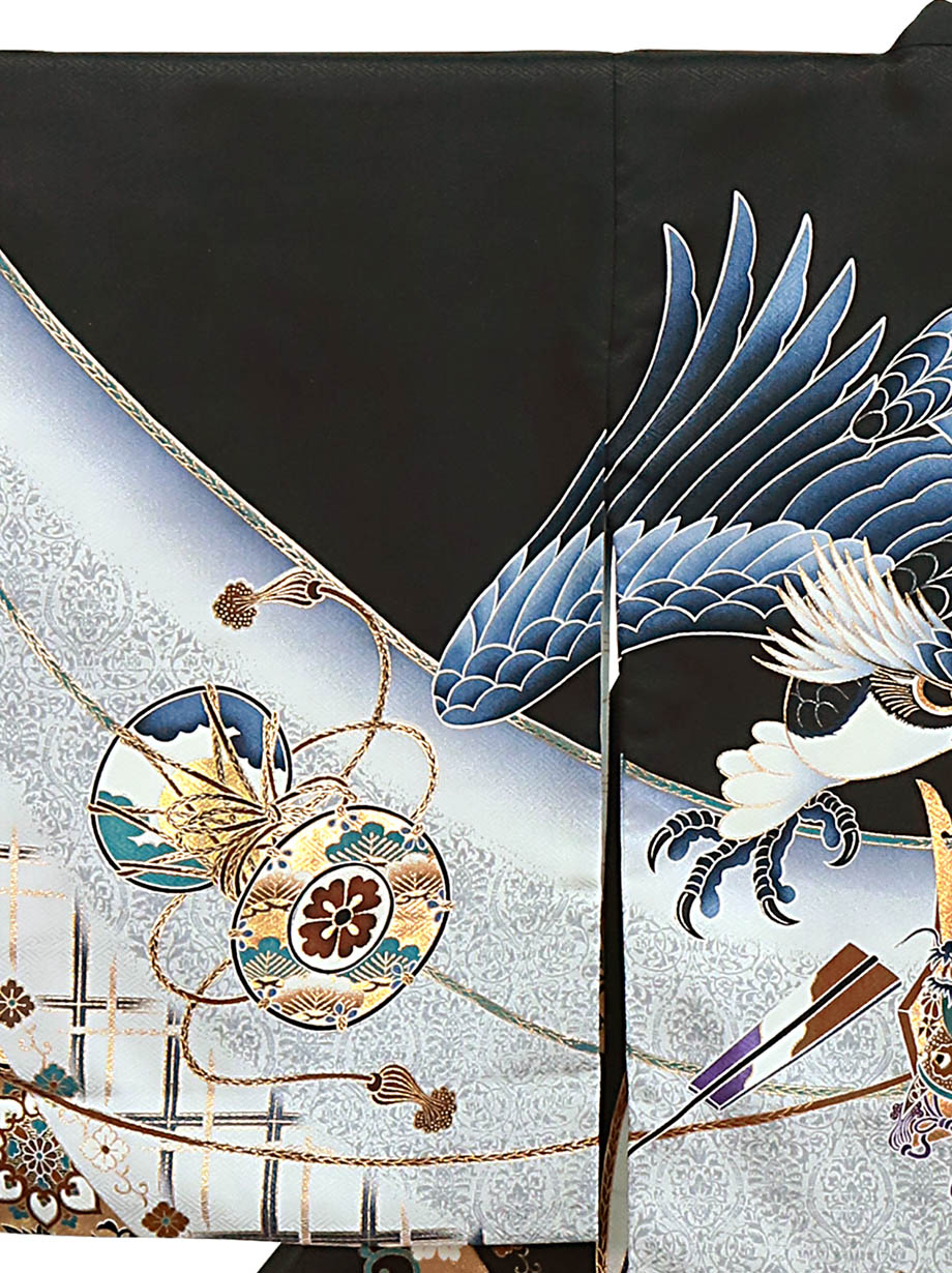 お宮参り産着/黒地に鷹と兜、華文の祝い着/男児(ポリエステル)