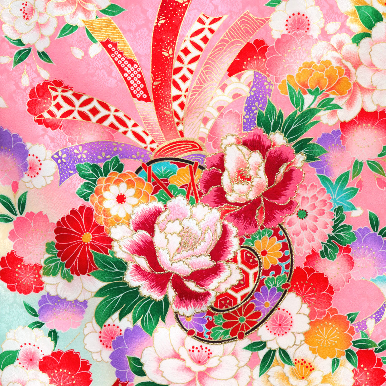 【2025年新作】お宮参り産着/ピンク地に鼓と牡丹の祝い着/女児
