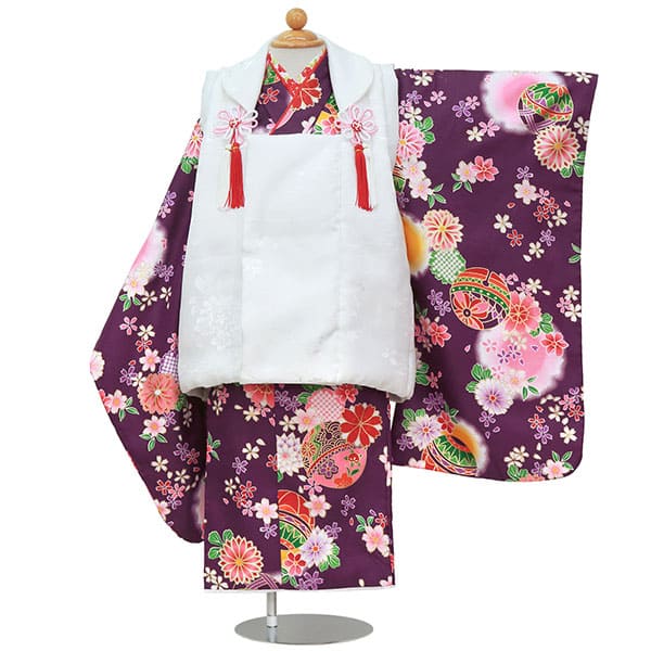 濃い紫に鞠と桜の着物、白無地の被布コートセット/七五三・三歳女の子